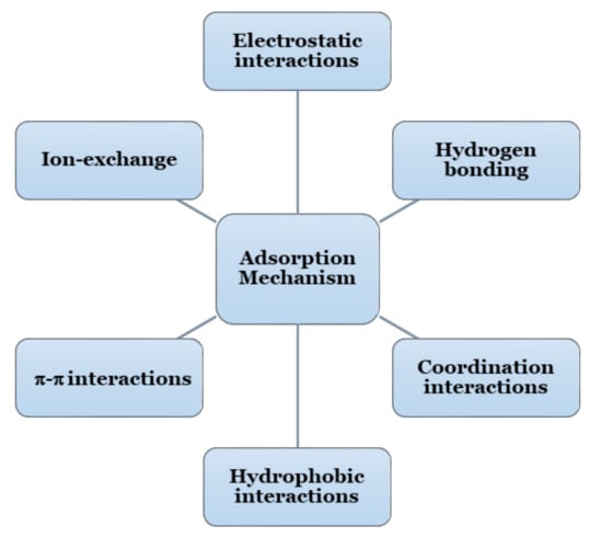 A comprehensive understanding of the adsorption process along with the removal mechanism of several pollutants on respective CBHs is very indispensable for further modification of CBHs to improve their adsorption performance. The adsorption by CBHs typically occurs through different types of interactions, which are extensively dependent on the functional groups present in the HG, adsorbent properties, the chemical composition of pollutants, and experimental parameters (i.e., initial pollutant concentration, solution pH, temperature, the coexistence of metal ions, etc.) [60]. The most common adsorption mechanism for the removal of dyes and heavy metals by CBHs is electrostatic interactions; however, combinations of other interactions along with electrostatic interaction are also reported in many adsorption processes [105,112,113,114]. The different adsorption mechanisms of dyes and heavy metals by CBHs are shown in Figure 3 and Figure 4.