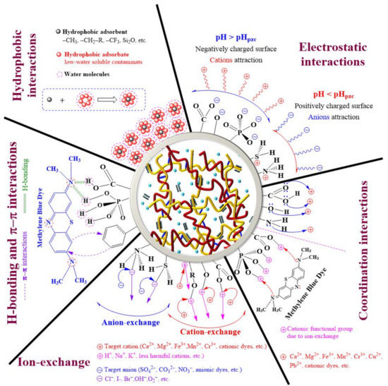 Electrostatic interaction comprises the interaction between charged modules; attractive and repulsive interaction occurs when molecules are oppositely-charged (cation–anion interactions) and similarly-charged (cation–cation or anion–anion interactions), respectively [115]. To remove ionic contaminants electrostatically by CBHs, the adsorbent surface must oppositely be charged to the respective ions that need to be adsorbed. Based on the pollutant nature and chemical properties, the CBHs are synthesized with specific functional groups, which are capable of producing the opposite charge corresponding to target ions [60]. Additionally, the formation of charged species on the adsorbent surface intensely depends on the pH of the solution [116]. pHPZC represents the pH of the solution when no charge species exist on the adsorbent surface [117,118,119]. At pH > pHPZC, functional groups, such as –COOH, –OH, and –H3PO4 are deprotonated due to an excessive concentration of OH in the aqueous solution that creates anions (such as –COO,–O, –PO43–, etc.) on the adsorbent surface, resulting in attractive interactions between cationic contaminants and the anionic adsorbent surface (Figure 4). In contrast, the adsorbent surface is positively charged pH < pHPZC due to the protonation of functional groups (i.e., –NH2, –SH, etc.) on the adsorbent surface as a consequence of an increase in H+ concentration in the solution. Here, a recent study also found the highest electrostatic interactions between a high-capacity HG with –NH2 groups and an anionic dye (Acid Black 1) at low pH conditions, which was decreased with rising pH and reached the least interactions for very high pH condition [112]. In another study, CMC adsorbed the utmost amount of Pb2+, Cu2+, and Ni2+ from aqueous solution through electrostatic interactions at higher pH [105]. Similar electrostatic nature was perceived for the removal of MB (a cationic dye) by chemi-mechanical pretreated cellulose-based superabsorbent hydrogel [97]. Hu et al. [120] also observed electrostatic adsorption with complexation between –OH and –COOH functional groups of sodium alginate–CMC–cellulose gel beads for the removal of Pb2+.