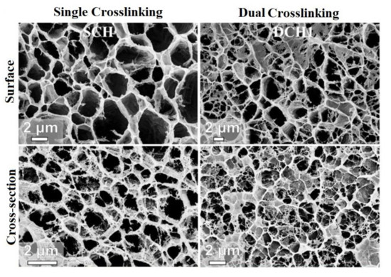 Crosslink density refers to the density of chains or segments that attach two or more parts of the polymer network, instead of the density of crosslink junctures. The adsorption capacity of CBHs is highly affected by the crosslink density of polymeric segments [167,168,169]. The highest adsorption capacities for CBHs are typically obtained for the lowest crosslink density and vice versa [168]. However, there is a minimum value of crosslink density, which is necessary to avoid mechanical failure or outright dissolution of the adsorbent materials [170]. At the point of the lowest crosslinking density, the molecular weight of the HGs is preferred to be high to ensure that most of the polymeric chains are bound by a minimum of one covalent bond to the rest of the material. Studies showed that higher molecular weight CMC HGs have a higher internal volume in the polymeric chain that causes an increase in the adsorption capacity of the HGs [169]. The surface and cross-section porous structure of a CBH is shown as a function of crosslinking density in critical content. The crosslink density of dual crosslinked hydrogel (DCH) was higher than single crosslinked hydrogel (SCH) because of a decrease in water content during crosslinking. Due to the increase of crosslink density in the polymeric network, the adjacent chains of HG materials came closer, resulting in a significant decrease of the surface and cross-section porous structure of DCH (Figure 5) [171].