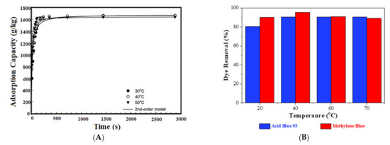 The adsorption capacity of CBHs greatly depends on temperature since the kinetic of adsorbate molecules in the aqueous solution is significantly changed when the temperature is raised. In the endothermic adsorption process, the adsorption capacity of CBHs is increased with the increase of temperature, which is the opposite of exothermic adsorption [100,182]. Typically, the adsorption capacity of CBHs for the removal of dyes from an aqueous solution is proportionally increased with temperature [46,183,184]. According to Lin et al. [46], the mobility of dye molecules is notably increased at higher temperatures, providing a higher potential to enhance the interactions between dye molecules and the adsorbent surface. As a result, the dye desorption from the adsorbent surface is minimized, leading to a higher adsorption capacity. Additionally, a swelling effect within the CBH structure may initiate due to the increase of temperature, causing the further penetration of dyes onto the adsorbent surface [182]. However, the adsorption capacity becomes independent of temperature when equilibrium is achieved (Figure 6B; blue bar). Similar to non-CBH adsorbent (Figure 6A), the adsorption capacity of CBH adsorbent is slightly fallen with an additional increase of temperature after equilibrium (Figure 6B; red bar) [184]. When adsorption takes place at a temperature higher than equilibrium temperature, the desorption characteristics of the CBH molecules become dominant, owing to the excessive molecular motion that causes such a slight decrease of the adsorption capacity [46]. Furthermore, similar to adsorptive removal of dyes from wastewater, CBHs show higher adsorption capacity for the removal of metal ions through endothermic adsorption [185], while the adsorption capacity is significantly lower for exothermic adsorption [186].