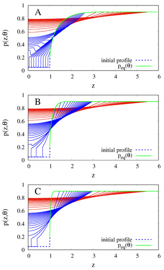 Spatio-temporal evolution of the overall probability density for increasing dimensionless time instants—namely, up to (blue curves) and up to (red curves). (A) ; (B) ; (C) .