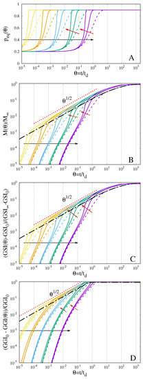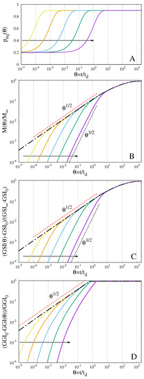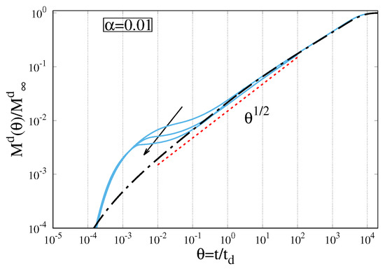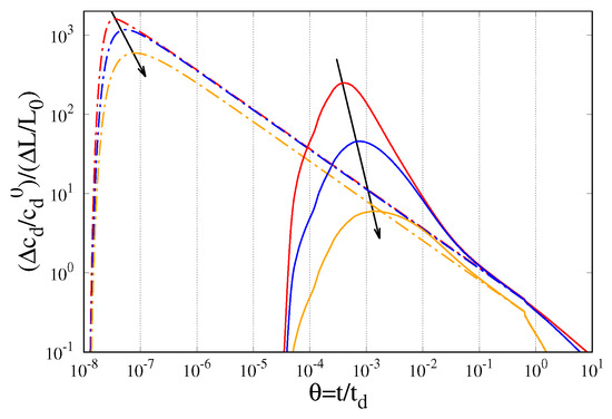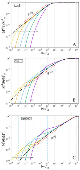 The comparison between the parabolic and the hyperbolic case is presented in Figure 3B, showing the temporal evolution of the amount of absorbed solvent , normalized with respect to its equilibrium value , for (parabolic case, dot-dashed black curves) and for increasing values of . It can be observed that, the larger —i.e., the larger the relaxation time is, the slower the sorption curve that follows an “anomalous” scaling before collapsing onto the sorption curve of the parabolic scheme when the boundary value reaches its asymptotic value , as shown in Figure 3A. The classical scaling of the standard parabolic scheme represents the envelope of sorption curves only for small-intermediate values of , namely . For higher values of , the sorption curves exhibit a smooth transition from the scaling to the asymptotic saturation behaviour and no scaling can be detected.