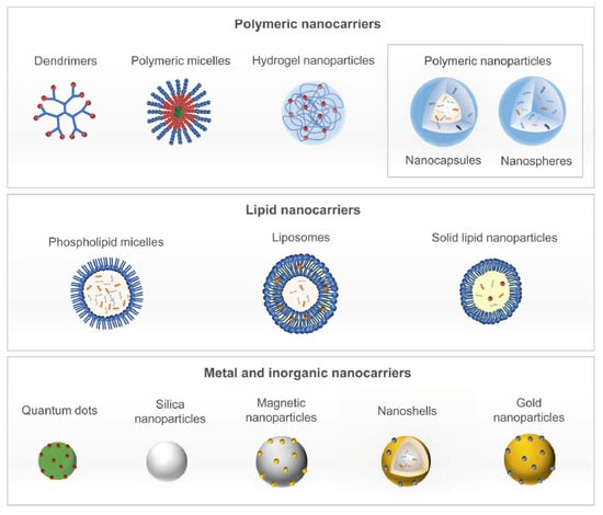 Nanomedicine is the design and development of therapeutics and diagnostic tools distinguished by the nanometric scale of its delivery vehicles and diagnostic agents with unprecedented safety and efficiency [23]. Nanotechnology deals with the manipulation of matter on the molecular scale, generally less than 1 μm. Nanoparticles (NPs) are thus minute particles, typically less than 200–100 nm in diameter, able to facilitate intracellular uptake and encapsulate therapeutic agents, releasing them in a controlled manner to specific diseased cells through passive or active targeting. The main properties of NPs are the large volume-to-surface area ratio, the size, modifiable external shell and surface properties, biodegradability, low cytotoxicity and optimization of pharmacokinetics reducing the dose [24]. The major classes of nanoparticles under study for cancer treatment are amphiphilic block copolymers that can self-assemble into micelles, polymers with pendant groups, lipid NPs that can be either solid with one layer or liposomes made of more than one wall (Figure 1) [25].