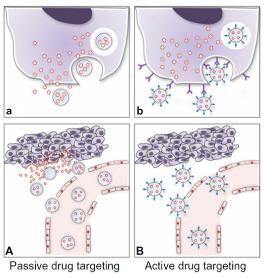 Drug targeting and localization of nanosystems. (A) Passive targeting through enhanced permeability and retention (EPR) effect and (a) drug releasing into the extracellular matrix (ECM), diffusing through the cell wall. (B) Active targeting with grafted ligands able to (b) target receptors of tumor cells enhancing uptake and internalization via receptor-mediated endocytosis. Reprinted with permission from Dove Medical Press [23].