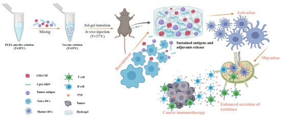 The newest use of this material—still currently under testing and improvement—involves immunotherapy: a PLEL reversible thermosensitive hydrogel for vaccine encapsulation. In this application, the cargo is composed of cytokines—involved in immune regulation, leukocyte proliferation and DCs activation—together with Toll-like receptor agonists aimed to activate antigen-presenting dendritic cells. The solution proposed, as soon as injected, forms a hydrogel scaffold thanks to micelles packing, releasing slowly and continuously antigens and immunomodulators able to locally recruit, activate and maturate DCs (Figure 3). The potential immunogenic environment created is demonstrated to eradicate colorectal cancer, emptying its cargo in seven days through a swelling diffusion process, which delays hydrogel degradation [47].