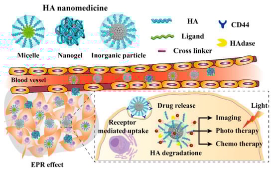 Schematic representation of the advantages and applications of hyaluronic acid (HA). EPR: enhanced permeability and retention; CD44: cluster determinant 44. Reprinted with permission from MDPI [98].