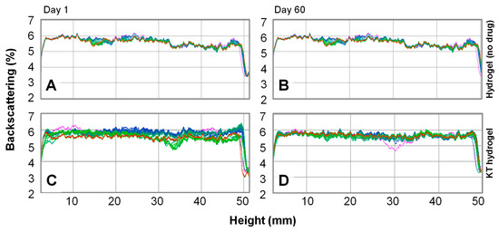 Figure 2. Hourly backscattering profiles over 24 h for (A) hydrogel without drug at day 1; (B) hydrogel without drug at day 60; (C) ketorolac hydrogel (KT hydrogel) at day 1; and (D) KT hydrogel at day 60. The color of the lines shows the hourly evolution within the day of analysis, being magenta the first and red the last analysis after the 24-h study.