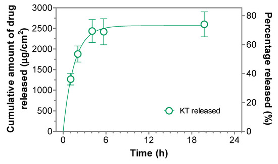 Figure 4. Cumulative amount of ketorolac released. Data followed a first-order (One-phase exponential association) kinetics. Values represent Means ± SD (n = 6).