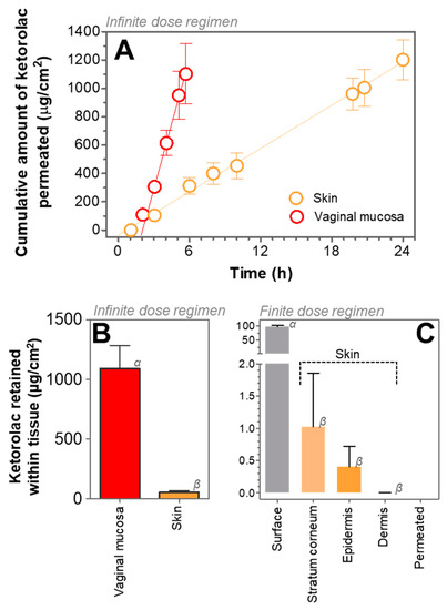 Permeation experiments were performed ex vivo to assess the permeation of ketorolac across human skin as well as across vaginal mucosa according to previously reported methodologies [9,20,21], in both cases under an infinite-dose regimen [22]. The cumulative amount of ketorolac permeated through each tissue along time is shown in Figure 5A, and the permeation parameters calculated can be seen in Table 2.