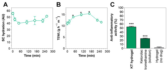 Figure 6. (A) Hydration of the stratum corneum upon application of KT hydrogel in humans. (B) Trans-epidermal water loss (TEWL) expressed in g of water per hour per m2 of skin, upon application of KT hydrogel in humans. (C) Anti-inflammatory activity expressed as inhibition (%) of TPA-induced inflammation upon application of a treatment (KT hydrogel, ketorolac tromethamine in solution, and hydrogel without drug). Values represent Means ± SD (n = 6). * Significant differences (p < 0.05); *** Significant differences (p < 0.001) as compared to control (hydrogel without drug).