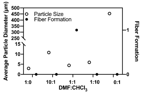 Average particle diameter and fiber formation of the varying DMF:CHCl3 spinning solutions.