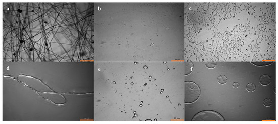 Optical microscopy images of (a) PAA spun with PS, scale bar 50 µm; (b) PAA particles with PS removed spun with DMF:CHCl3 1:0, scale bar 50 µm; (c) PAA particles spun with PS removed with DMF:CHCl3 10:1, scale bar 25 µm; (d) PAA thread spun with PS removed with DMF:CHCl3 1:1, scale bar 100 µm; (e) PAA particles spun with PS removed with DMF:CHCl3 1:10, scale bar 25 µm; and (f) PAA droplets spun with PS removed with DMF:CHCl3 0:1, scale bar 200 µm.