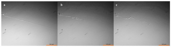 The resulting PAA was swollen and deswollen using varying solutions to demonstrate its anticipated properties as an anionic polyelectrolyte and to loosely mimic the contraction and expansion of muscle. The PAA was equilibrated in each solution prior to imaging, resulting in a swelling/deswelling effect based on ion exchange. Figure 3 shows an optical micrograph of an isolated PAA thread (Na+ form) equilibrated in DI water and then treated with 500 mM CaCl2. A significant axial contraction (ca. 44%) is observed (Figure 3b), as expected from studies on similar gels of much larger dimensions [3,4,19,20]. The chelation of Ca2+ was expected to at least partially restore the original dimensions of the thread. Toward that end, we employed ATP as a Ca2+ chelator [21], and indeed a partial reswelling (ca. 75%) of the original thread length was observed (Figure 3c). A full re-extension to the initial length was of course not expected for entropic reasons. However, the fact that two key, biologically relevant species can elicit motion in thin PAA threads is especially interesting for the design of synthetic cytoskeletons for artificial cells. The thin PAA threads are expected to facilitate the kinetics of these ion-exchange processes, and this is a subject of continuing studies that include the influence of the bathing salt solution type and concentration on kinetics. Admittedly, the free radical polymerization of these gels leads to heterogeneities in the gel network, which can lead to asymmetric bending that is characteristic for these gels.