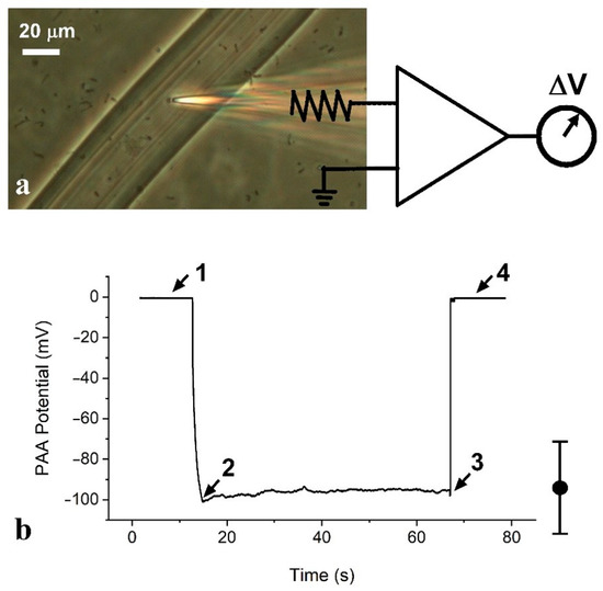 It is known that PAA gels exhibit negative electrical potentials (relative to the bulk external solution) with a sign and magnitude that is surprisingly similar to living cells [22], albeit at a low bathing ionic strength in our experiments. To further characterize the properties of our PAA gel threads, electrical potentials were measured with threads after immersion in 16 mM KCl for 24 h using standard electrophysiological methods. The procedure for physically measuring the electrical potential difference (ΔV) between the bulk solution and the interior of the PAA threads involved inserting the recording micropipette into the PAA threads under simultaneous visual guidance through an inverted microscope and electrical potential monitoring with a differential amplifier (Figure 4a). Because the PAA threads adhered to the glass bottom of the recording chamber, they did not need to be mechanically held in place. Voltage recordings started with the micropipette outside the PAA thread, which was used as the zero-millivolt baseline, measured in relation to a ground Ag/AgCl electrode in the bathing solution (Figure 4b; arrow “1”). When the micropipette was lowered into the PAA, we could observe the penetration of the fiber both optically and by the simultaneous negative change in the pipette-tip potential (Figure 4b; arrow “2”). This negative potential difference measurement was robust and quickly stabilized at several tens of negative millivolts in relation to the reference potential in the bathing solution (Figure 4b; arrow “3”). Importantly, an additional penetration of the micropipette beyond the initial level produced no alteration in this measured negative internal potential. When the micropipette was removed from inside the thread, the recorded potential quickly returned to the reference, ground level (Figure 4b; arrow “4”). The optical visualization of the track that was left after the pipette was removed (not shown) provided additional confirmation of the micropipette’s penetration of the PAA thread. This protocol allowed for very stable and reproducible recordings across dozens of PAA threads. Ten measurements from a thread 15 µm in width produced a mean potential difference (ΔV) of −93.6 ± 22.8 mV (arithmetic mean ± standard deviation).