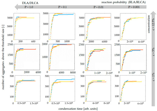 Figure 1 presents an examination of the influence of the DLA/DLCA to RLA/RLCA transition on the numerically designated condensation reaction kinetics curves. The model parameters were (i) concentration of aerogel secondary particles, c, and (ii) probability of condensation reaction, P. Simulations were conducted for three chosen concentration values: c ≈ 1%, 5% and 12.5% and four probability values: P = 0.001, 0.01, 0.1 (reaction-limited (cluster) aggregation, RLA/RLCA) and 1 (diffusion-limited (cluster) aggregation, DLA/DLCA). Simulations were conducted three times for every case to verify the results’ repeatability (blue, red and yellow curves, as shown in Figure 1).