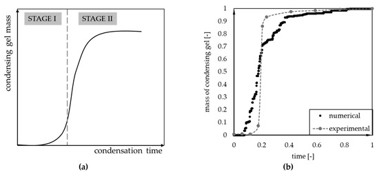 Figure 2b presents preliminary comparison of the numerically obtained kinetics curve (model parameters: P = 0.01, c = 12.5%) and experimental measurements. The chemical composition of the sample was 1:2:0.6:0.6 (vol. MTMS: MeOH: oxalic acid 0.01 M: ammonia 1 M) [22]. The results were normalized to the maximum value of condensing aerogel mass and total measurement time. The comparison indicates a similarity between the shape of experimental and numerical curves.