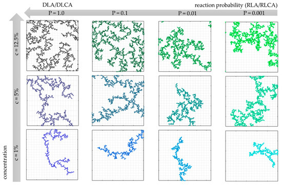 Figure 3 presents the visualizations of the final structures obtained by the cellular automata modeling for the chosen values of reaction probability and concentration. For each concentration value (c ≈ 1%, 5% and 12.5%), one can notice that the structure becomes more dense and compact along with the decrease in the condensation reaction probability value. This is a consequence of reaction-limited aggregation—the probability of merging particles/clusters is significantly lower. Thus, the particles are more likely to penetrate the structure deeper until they join the aggregate at some point.