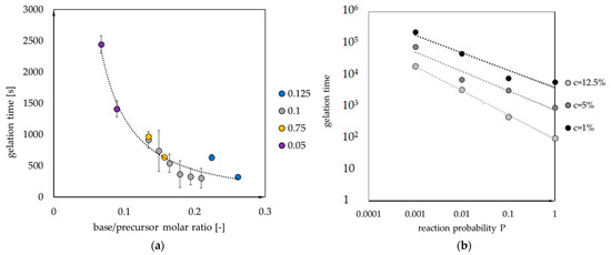 The dependence of (a) gelation time on base/precursor molar ratio (for different base/acid ratios, marked with different point colors) and (b) logarithm of gelation time on the reaction probability logarithm.