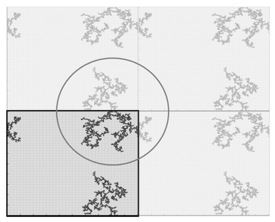 The two-dimensional computing domain representing the condensing mixture was divided into a regular grid of cells with periodic boundary conditions (Figure 8). Each cell can be described by one of a finite number of states—in this particular case, we only had two possible states: (i) a cell was occupied by a secondary particle or (ii) the cell was empty. According to the set percentage concentration value (assumed to be a ratio of occupied to total number of cells), the number of secondary particles was given as one of the model parameters. An initial state of the system (for t = 0) was pseudo-randomly generated. According to the set reaction probability value, if two particles meet in the adjacent cells (the Moore type of neighborhood was applied), the reaction of condensation can occur. The reaction probability is a significant model parameter deciding whether aggregation is limited by diffusion (P = 1, DLA/DLCA) or reaction (P < 1, RLA/RLCA). If the reaction between adjacent cells does indeed occur, the two particles start to act as one aggregate. Particles belonging to different aggregates may also join each other if they appear in neighboring cells. The probability of reaction is assumed to be the same as for free particles. The reaction between particles that already belong to aggregates results in the aggregate growth according to the DLCA or RLCA mechanism, depending on P value.