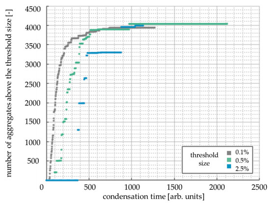 The developed model also provides the aggregates’ size distribution (dependent on the number of particles within the aggregates) during the condensation time. The exemplary results are presented in Figure 5. At the system’s initial state (t = 0), the vast majority of particles are single (not connected). However, some particles already merge at the stage of random generation of their initial location. During the condensation, the total number of aggregates decreases, and the distribution moves towards bigger aggregates until the system is entirely cross-linked (t = 1427 dt).
