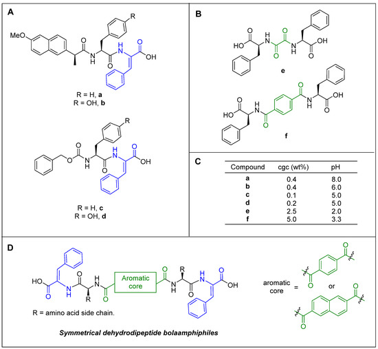 Our research group, and others, have reported new dehydropeptides capable of forming hydrogels. The presence of a dehydroamino acid residue imparts increased proteolytic resistance into the hydrogels, as well as different physical properties arising from the decreased structural flexibility of the dehydropeptide chain [13,14,15,16]. In our laboratories, several dehydrodipeptides capped on the N-terminus with naproxen (e.g., Npx-L-Phe-Z-ΔPhe-OH and Npx-L-Trp-Z-ΔPhe-OH) were prepared and tested as hydrogelators, providing hydrogels with critical gelation concentrations (CGCs) of between 0.4 and 0.6 wt % and a gelation pH of between 5 and 8. These materials showed promise as controlled drug delivery systems, in release studies using anti-cancer compounds such as curcumin and doxorubicin [12,13]. More recently, we found that compounds containing a structurally simpler carboxybenzyl (Cbz) group attached to the N-terminus of dehydrodipeptides (i.e., Cbz-L-Phe-Z-ΔPhe-OH and Cbz-L-Tyr-Z-ΔPhe-OH) are capable of forming hydrogels with very low CGCs (0.1%) and therefore represent a new minimum gelator module for this class of gelator, at least under the gelation conditions tested (Figure 1A) [17].