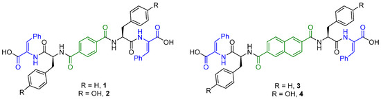 Compound 9 (0.11 mmol, 84.0 mg) was dissolved in 1,4-dioxane (3.21 mL) and NaOH (1 M) (3.0 equiv., 0.32 mL). The reaction was monitored by TLC. When the starting material was consumed (typically 4 h), the organic solvent was removed under reduced pressure, and the reaction mixture was acidified to pH 3 with KHSO4 (1 M). The solid precipitate was filtered, affording compound 1 (66.0 mg, 0.09 mmol, 82%), as a white solid. 1H-NMR (400 MHz, DMSO-d6, δ): 3.02–3.08 (2H, dd, J = 10.8 and 13.7 Hz, β-CHAHB); 3.21–3.24 (2H, dd, J = 3.6 and 13.7, β-CHAHB); 4.84–4.89 (2H, m, α-CH); 7.14–7.33 (14H, m, ArH and β-CH ∆Phe); 7.40–7.42 (4H, d, J = 7.2 Hz, ArH Phe); 7.65–7.67 (4H, m, ArH ∆Phe); 7.85–7.87 (4H, m, ArH central ring); 8.79–8.81 (2H, d, J = 8.4 Hz; α-NH Phe); 9.79 (2H, s, α-NH ∆Phe), 12.7 (2H, s, CO2H) ppm. 13C-NMR (100.6 MHz, DMSO-d6: δ): 36.5 (CH2, β-CH2 Phe), 55.2 (CH, α-CH Phe), 126.6 (C, α-C ∆Phe), 126.3 (CH), 127.3 (CH), 128.1 (CH), 128.5 (CH), 129.2 (CH), 129.2 (CH), 130.0 (CH), 131.9 (CH, β-CH ∆Phe), 133.6 (C), 136.3 (C), 138.4 (C), 165.8 (C, C=O), 166.2 (C, C=O), 171.1 (C, C=O) ppm. HRMS (ESI): m/z: [M + H]+ calcd. for C44H38N4O8 751.26896; found 751.27670.
