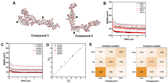 (A) Snapshot of the largest cluster resulting from the self-assembly of compound 3 and compound 4, only depicting the 2,6-naphthalenedicarboxyl block. The arrows indicate stacking of the naphthalene moieties. Time evolution of the SASA for the (B) peptide residues and (C) aggregates in simulations of different concentration. (D) Moments of inertia of the clusters in the final snapshot for both compounds 3 and 4 in different concentrations, which for a one-dimensional aggregate: Ix << Iy ≈ Iz. (E) Average contact number between different pairs of the compounds calculated from the last 2 µs of simulation.