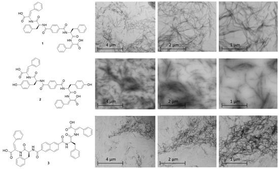 The micro- and nanostructures of the new hydrogels were studied using scanning transmission electron microscopy (STEM). The STEM images of hydrogels obtained from compound 1–3 are shown in Figure 4. Compounds 1–3 display an entangled fibril structure that is the result of peptide self-assembly. In general, the fibers formed by compound 1 (Figure 4) display a thickness of around 35–47 nm, and the length is approximately 0.46–0.88 μm. Dehydropeptide 2 (Figure 4) shows fibers with diameters around 35–47 nm and lengths between 0.6 and 1.8 μm. Finally, compound 3 (Figure 4) shows fibers with a thickness around 17–27 nm and lengths between 0.3 and 0.8 μm.