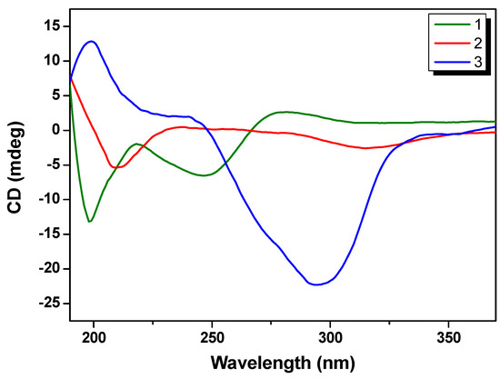 CD spectra of diluted aqueous solutions of compounds 1, 2, and 3.