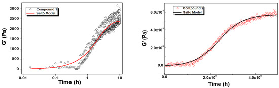 Time dependence of the storage modulus G′ (symbols) recorded during the gelling of compounds 1 and 2, fitted with Equation (1)–line.