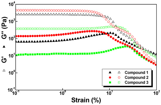 Strain dependence of the shear elastic G′ (empty symbols) and loss G″ (filled symbols) moduli for compounds 1, 2, and 3.