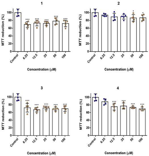 MTT reduction of HaCaT cells treated with compounds 1, 2, 3, and 4 for 24 h, at the concentrations presented. * p < 0.05, *** p < 0.001.