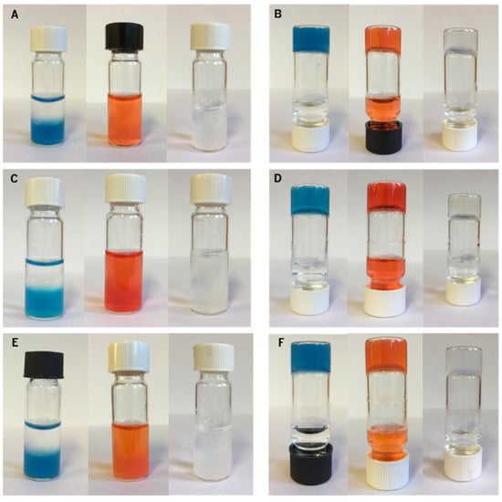 Representative images of hydrogels layered with water after a saturating release study (6 days). (A) Hydrogels of 1 loaded with methylene blue (left), methyl orange (center), and ciprofloxacin (right), that were layered with 1.5 mL of H2O. (B) Inverted vials from panel (A). (C) Hydrogels of 2 loaded with methylene blue (left), methyl orange (center), and ciprofloxacin (right), which were layered with 1.5 mL of H2O. (D) Inverted vials from panel (C). (E) Hydrogels of 3 loaded with methylene blue (left), methyl orange (center), and ciprofloxacin (right), which were layered with 1.5 mL of H2O. (F) Inverted vials from panel (E).