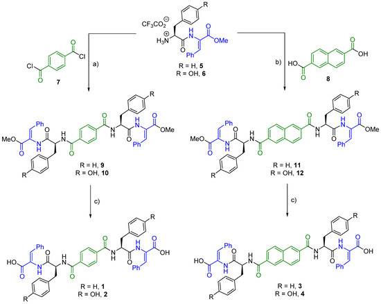 The synthesis of bolaamphiphilic bis-dehydropeptides 1–4 is shown in Scheme 1. The intermediates H-L-Phe-Z-ΔPhe-OMe.TFA 5 and H-L-Tyr-Z-ΔPhe-OMe.TFA 6 were synthesized by a known route [13]. The reagents terephthaloyl chloride (7) and naphthalene-2,6-dicarboxylic acid (8) were employed to install the central aromatic portion. Thus, dimeric dehydropeptides 1 and 2 were prepared in good yields by a double nucleophilic substitution of 5 and 6 onto the diacyl chloride 7, whereas dimeric dehydropeptides 3 and 4 were prepared in high yields by a double amide coupling protocol of 5 and 6 onto diacid 8, employing HBTU. Ester hydrolyses using NaOH converted compounds 9–12 into the target diacids 1–4 in high yields.