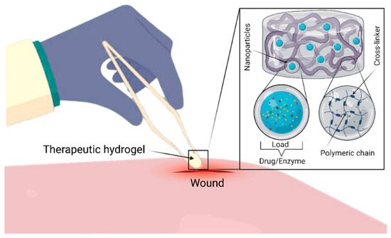 Materials science is a field in which nanotechnology is being greatly explored, due to how much the bulk and surface properties previously mentioned, such as structural tunability, functionalization, and physicochemical stability, etc., are observed to change with diverse synthetization protocols in order to form customized nanostructured materials [5,6]. Materials properties, such as shape, size, crystal structure, and surface roughness, can be taken advantage of and are currently being applied to practically any area of the biomedical field, such as wound healing and drug delivery around the globe with exceedingly successful results [7]. The use of nanostructured materials in the form of nanoparticles, nanofibers, and any shape given at the nanoscale (1–100 nm), applied towards biotechnological and/or biomedical applications, such as wound healing, treatment of emerging pollutants, and drug delivery, has been exponentially growing over the past few decades [8,9,10]. Researchers, engineers, and renowned companies have become very interested in the future of applied nanosystems and are currently striving to achieve more advanced technological options by using the outstanding and often surprising properties of nanomaterials to overcome emerging challenges and solve current problems of the modern era [11]. The scope of nanostructured materials used for biotechnological and biomedical applications is very broad due to the usage of metallic nanoparticles, nanostructured biopolymers, and ceramics in the form of nanoclays [12]. Each of these classifications has its own derivations of new subclasses of materials, such as nanocomposite hydrogels and carbon-based nanostructures, which have gained an important role in the field of nanotechnology as to even be considered and named as stand-alone materials [13]. By decreasing the size of a system to a nanometric scale, its contact surface increases exponentially while its volume decreases, leading to particular physico-chemical properties that are viable for numerous biomedical applications such as wound healing [14]. Figure 1 shows a simplified representation of polymer-based therapeutic gel deployment for wound healing. The size and shape of nanostructured systems are key factors that determine their potential in wound healing processes by influencing drug/growth factor delivery efficiency, diffusion through cell membranes, and cellular/tissue reactions [15].