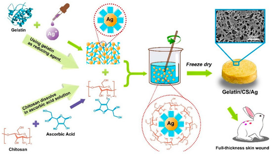 The preparation process and the principle of composite gelatin/CS/Ag-based composite with enhanced antimicrobial and wound-healing activity. Reprinted from Ref. [20] with permission from Elsevier. License Number: 5063250903839.