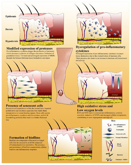 Certain complications may arise during the wound healing process, which includes dehiscence, herniation, wound infection, delayed healing, and excessive scar formation [34]. A combination of overlapping factors, such as local tissue ischemia, repeated trauma and ischemia/reperfusion injury, tissue necrosis, compromised cellular and systemic stress response, and essential bacterial infection, can result in non-healing or chronic wounds [35]. Additional to the local factors, systemic ones include age, gender, hormones, stress, ischemia, diseases (diabetes, keloids, fibrosis, hereditary healing disorder, jaundice uremia), obesity, medications (glucocorticoid steroids, non-steroidal anti-inflammatory drugs, chemotherapy), alcoholism and smoking, immunocompromised conditions (cancer, radiation therapy), and nutrition [36]. Chronic wounds can generally be classified into three most common categories: diabetic foot ulcers (DFUs), pressure ulcers (PUs) and venous leg ulcers (VLUs). Given variations in molecular etiology, these wounds share similar elements: (i) modified expression of proteases, (ii) dysregulation of pro-inflammatory cytokines, (iii) presence of senescent cells, (iv) high oxidative stress and low oxygen levels, and (v) formation of biofilms [37]. In spite of the variances that exist in the molecular etiology of chronic wounds, these share common elements, as summarized in Figure 3 [37].