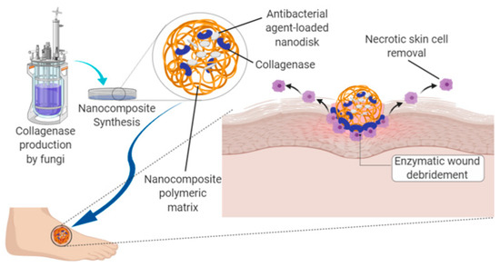 Damaged tissues increase the formation of reactive oxygen species (ROS) and decrease the amount of different enzymatic and non-enzymatic free-radical collectors. The presence of ROS radicals negatively affects the wound healing process. Additionally, excessive amounts of ROS cause irritation, soaring, cell death, and minimization of the healing process [40]. Figure 4 shows the formulation of an optimized nanocomposite material by encapsulating enzymes, such as collagenase, gelatinase, or trypsin, within a polymeric matrix for treating the main setbacks in the wound healing process.