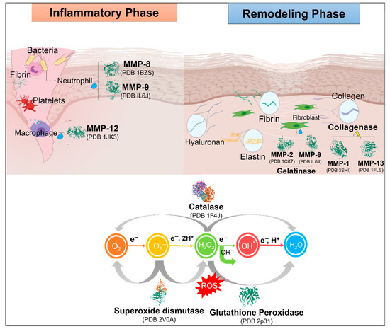 Moreover, a plethora of causes feed an unfavorable microenvironment that impedes cutaneous repair, such as hyperglycemia, persistent inflammation, and growth factor, and cytokine deficiencies lead to impaired stem cell recruitment for sufficient angiogenesis [38]. Therefore, an increasing interest in understanding the mechanisms that contribute to non-healing wounds, such as reduced bioavailability of growth factors and receptors, irregular production/modification of matrix proteins, decreased proliferative capacity of resident cells, and inadequate or impaired wound perfusion [39]. The previously mentioned elements shared between chronic wounds involve, in different levels, the activity of enzymes that impact negatively or positively on the wound healing process.