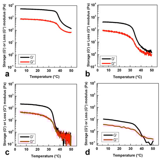To conduct a thermo-rheological analysis, samples were dispersed in MilliQ water at a concentration of 5% w/v. Clear homogeneous dispersions were obtained by placing the samples at 90 °C for 15 min. A parallel-plate geometry of 20 mm diameter was used for the experiments. Temperature dependence of the storage modulus (G′) and loss modulus (G″) values was analyzed by cooling the samples from 50 °C to 5 °C at a rate of 2 °C/min by applying a constant strain of 1% and a frequency of 0.5 Hz (3.14 rad/sec). Samples were previously equilibrated at a temperature of 50 °C for 60 s and a pre-shear of 0.01 Hz for 10 s was performed. The linear viscoelastic region was preliminarily assessed at both 50 °C and 5 °C by strain sweep experiments, applying a constant frequency of 0.5 Hz in the range between 0.5–40% of deformation.