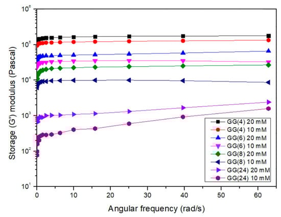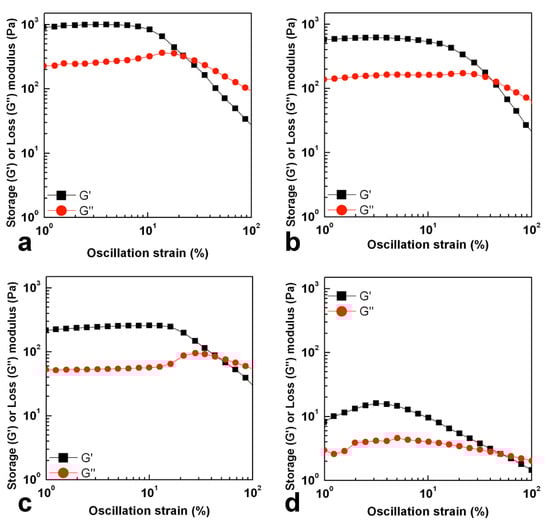 In high molecular weight samples, the chains, in aqueous solutions at 25 °C, assume a helix conformation and the chains are highly extended due to the electrostatic repulsion from the charged groups on the side chains. When a deformation is applied, the molecules may align and, up to a certain strain, G″ slightly increases. When a large deformation is applied, over the critical strain, the complex structure is destroyed, after which the polymer chains align with the flow field, and G″ decreases. The relative intensity of the overshoot and the strain value at maximum G’’ decreases with the increase in molecular weight. Indeed, this behavior is more evident for GG8 while it is less pronounced for GG4 and GG6 (Figure 3), showing the strong impact of the molecular weight on the sample microstructure interactions. This can be probably explained assuming that as the molecular weight increases, chains are forced together to be closest and the electrostatic repulsion can be stronger than the capacity to form weak interactions, resulting in a faster disruption of the microstructure for GG4 and GG6 compared to GG8.