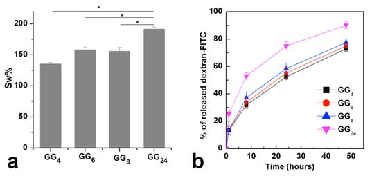 These data are in accordance with those obtained from swelling studies that, besides revealing that all the investigated sample show a high capacity of incorporate aqueous medium, also demonstrate that GG24 hydrogel, due to its less-dense network, swells significantly more compared with the hydrogels produced, starting from products with a higher molecular weight (Figure 6a).