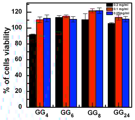 It is possible to notice that, for almost all the investigated samples and at all the concentrations tested, a slight increase in cell viability compared to the control was observed after 24 h of incubation. No significant differences were noticed between different samples or between different concentrations, except for GG4 at 0.2 mg/mL, which shows a significant (p < 0.05) decrease in cell viability compared to its lower concentrations or to other investigated samples (Figure 9). It is likely that, for this sample, the formation of coarse particles that settle onto the cells can cause a slight decrement in the cell growth. In any case, the viability for this sample is higher than 90%.