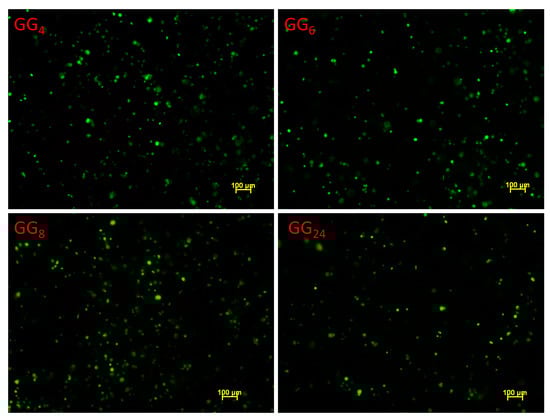 Live/dead staining of MC3T3-E1 preosteoblastic cells encapsulated into GG products after 24 h of culture.
