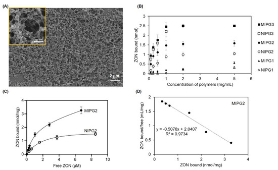 (A) SEM image of the MIPGs_ZON. (B) Equilibrium binding isotherms for 2.5 μM ZON on MIPGs_ZON at concentrations ranging from 0.1 to 5 mg/mL in 1 mL ACN. Data are means from three independent experiments. The error bars represent standard deviations. (C) Determination of the binding capacity of 1 mg MIPG2 and NIPG2 towards ZON varying from 0.5 to 10 μM in 1 mL ACN, respectively. Data are means from three independent experiments. The error bars represent standard deviations. (D) Corresponding Scatchard plot of MIPG2.