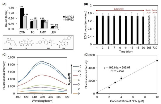 For MIPGs_ZON, the equilibrium binding experiments with ZON were performed in anhydrous acetonitrile. The particles of 10 mg MIPGs_ZON and NIPGs_ZON were suspended in 1 mL ACN with intensive sonication (ultrasonic power: 80 W, frequency: 40 KHz, 20 min), in order to work as stock solutions, respectively. Then, polymer concentrations at 0.1, 0.25, 0.5, 1, 2, 5 mg/mL were incubated with 2.5 µM ZON in 1 mL ACN overnight. The samples were then centrifuged at 17,500 rpm for 20 min and a 700 μL aliquot of the supernatant was taken for unbound ZON determination. Then, the amount of bound ZON was calculated by subtracting the amount of unbound from the total. A calibration curve of ZON (Ex = 280 nm, Em = 455 nm, slit: 5) was obtained on F-7000 spectrofluorometer (Hitachi High-Technologies, Tokyo, Japan), as shown in Figure S1. To investigate the binding capacity, 1 mg of polymers were incubated with ZON varying from 0.5 to 10 μM in 1 mL ACN, with results plotted with the Langmuir-type isotherm equation. The selectivity study was performed by testing the binding of 1 mg polymers towards 2.5 μM ZON, and three structurally similar reagents: Tetracycline (TC), amoxicillin (AMO), and levofloxacin (LEV).