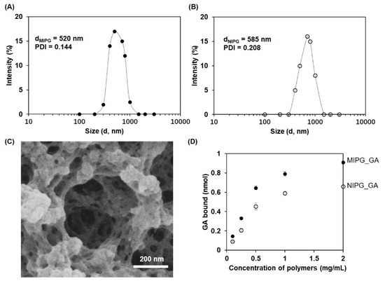 Dynamic light scattering measurements of 0.5 mg/mL (A) MIPG_GA and (B) NIPG_GA in H2O (mean value of two experiments). (C) SEM image of MIPG_GA. (D) Equilibrium binding isotherm for 1 mM GA on MIPG_GA and NIPG_GA at the concentrations ranging from 0.1 to 2 mg/mL in water. Data are means of three independent experiments. The error bars represent standard deviations.