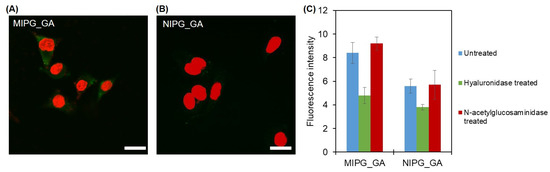 Confocal microscope images of fixed Hela cells incubated MIPG_GA (A) and NIPG_GA (B), that exhibit green fluorescence under proper filter sets of confocal microscopy. Nuclei stained with PI (red). Scale bar: 50 μm. (C) Summarized histogram results showing the binding performance of polymers towards untreated, hyaluronidase treated, and N-acetylglucosaminidase treated Hela cells. Data are means of three independent experiments. The error bars represent standard deviations.