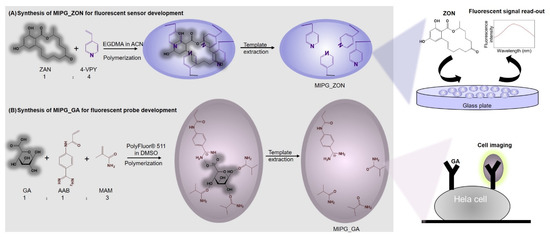 Aiming at developing convenient MIP-based sensors towards commercial applications in the future, two typical fluorescent sensors were generated, possessing the sensing mechanism either via the analyte’s self-fluorescence property or receptor’s fluorescence effect, respectively (Scheme 1). Specifically, a molecularly imprinted polymeric hydrogel (MIPG) was synthesized for zearalenone (ZON), a mycotoxin produced by several species of Fusarium molds to contaminate cereals, in particular corn, barley, oats, wheat, and sorghum [25], causing toxic effects in humans and animals, including nephrotoxic, neurotoxic, carcinogenic, estrogenic, and immunosuppressive effects [26]. Specifically, MIPG_ZON was developed using an optimized amount of 4-vinylpyridine (4-VPY) as a functional monomer and ethylene glycol dimethacrylate (EGDMA) as a cross-linking monomer against the zearalanone (ZAN, an analogue of ZON but without a double bond, which may interfere with the polymerization process). Afterwards, the synthesized MIPG_ZON was grafted on the glass plate to detect the ZON in corn juice. In parallel, a fluorescein-incorporated MIPG was generated for the direct recognition of glucuronic acid (GA), a small monosaccharide as the epitope of hyaluronic acid, the biomarker of cancerous or infectious cells on the cell surface [27,28,29]. The obtained MIPG_GA was fluorescein dimethacrylate (PolyFluor® 511) cross-linked using two functional monomers, (4-acrylamidophenyl)(amino)methaniminium acetate (AAB) that interacts with the carboxylic group of GA with high affinity, and methacrylamide (MAM) which provides hydrogen bonds to GA. The final application of MIP_GA in cancer cell imaging showed a great potential of our MIP as a fluorescent probe for biomedical analysis.
