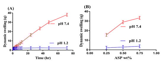 Swelling studies were conducted for ASP/ALPAA hydrogels at both acidic and basic media, i.e., at pH 1.2 and 7.4, respectively, as shown in Figure 1A–D. The pH value highly influences the dynamic swelling of developed hydrogels as maximum swelling is shown at a higher pH of 7.4 compared to a lower pH of 1.2 (Figure 1A). This behavior of the fabricated system is due to the deprotonation of functional groups of both polymers and monomers at higher pH. ASP contains COOH and NH3+ groups which are protonated at acidic pH 1.2. Similarly, AL and AA have COOH functional groups which are protonated at an acidic pH, i.e., pH 1.2. They form conjugate and strong hydrogen bonding, due to which the hydrogels network is collapsed. However, as the pH of the medium is increased, increase in deprotonation of COOH and NH3+ groups is observed, which leads to increase in charge density and thus generate strong electrostatic repulsive forces. This forces result in an increase in swelling of fabricated hydrogels and thus higher swelling is exhibited at higher pH [27,28].